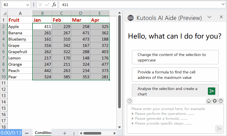 Si prefieres un método más rápido sin fórmulas, Kutools para Excel ofrece una herramienta impulsada por IA que facilita aún más el resaltado de los valores más altos o más bajos. Esta función utiliza comandos en lenguaje natural para formatear automáticamente tus datos; no se requiere codificación ni configuración de reglas.